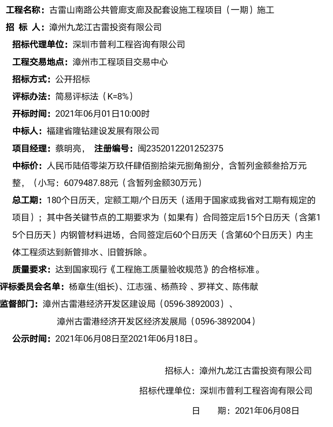 古雷山南路公共管廊支廊及配套設(shè)施工程項(xiàng)目(一期)施工中標(biāo)結(jié)果公示